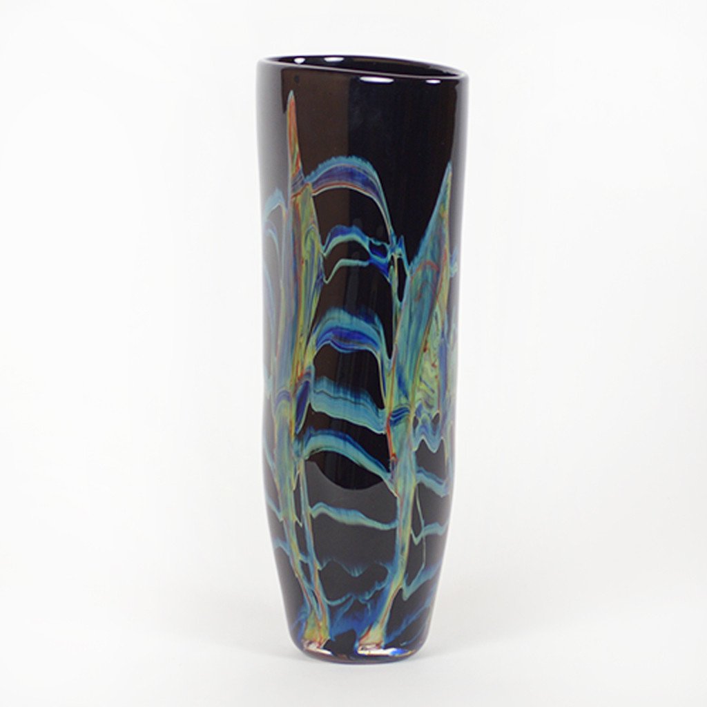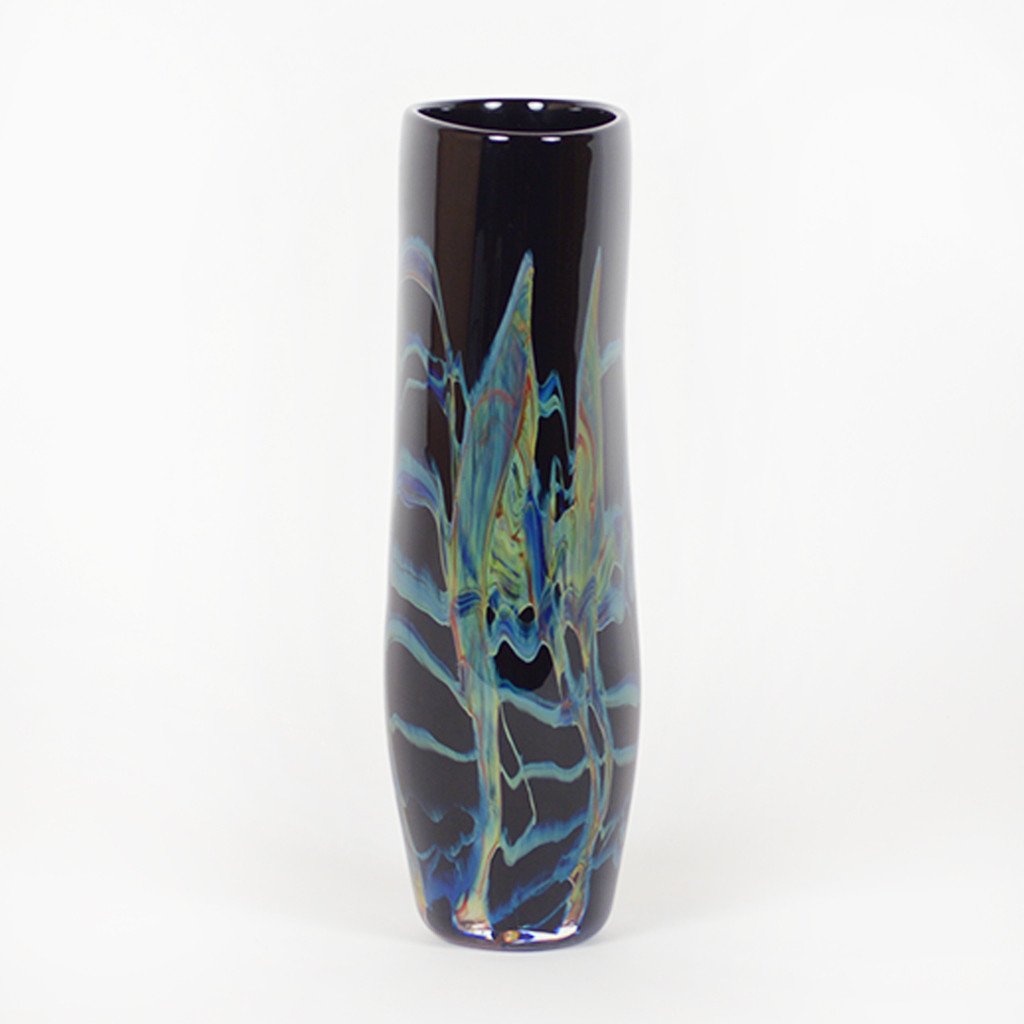 Inspired by the Aurora Borealis, this art glass collection features deep black tints and luminous accents of blue representing the wide-open sky of the northern hemisphere. These hand blown glass vases are made to order unless indicated as available