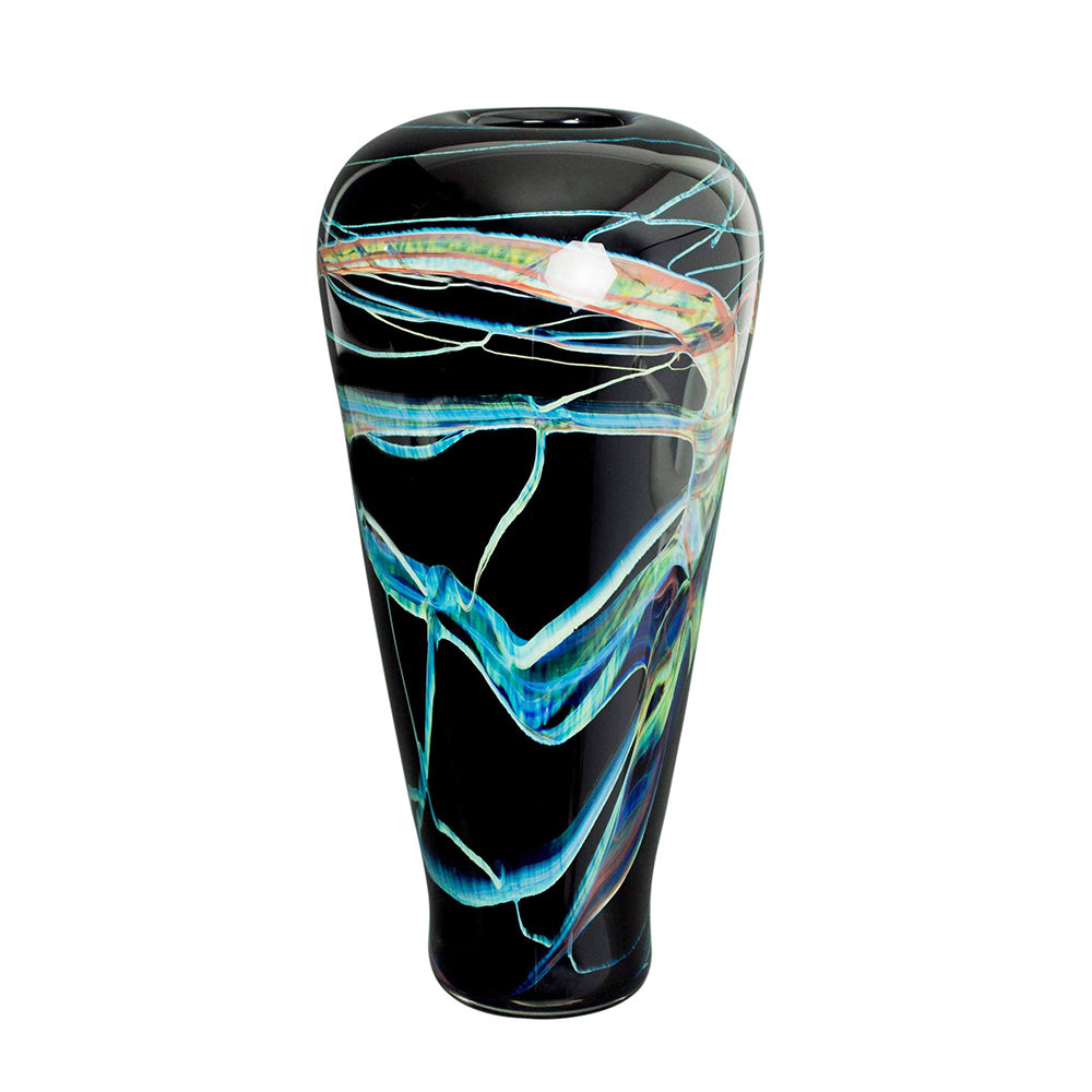 Inspired by the Aurora Borealis, this art glass collection features deep black tints and luminous accents of blue representing the wide-open sky of the northern hemisphere. These hand blown glass vases are made to order unless indicated as available